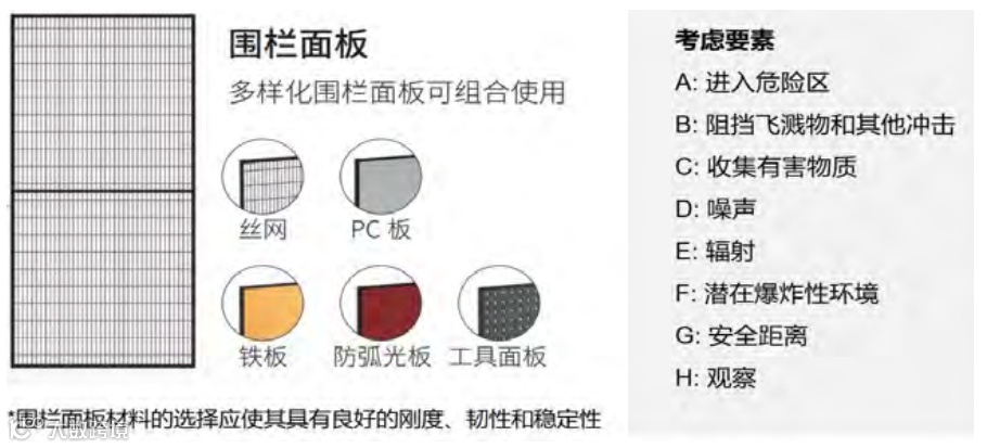 防护装置要容纳或捕获由机器抛出或掉下的材料、工件、切屑、液体,减少由机器产生的排放(噪声、辐射、有害物质,如粉尘、烟雾、气体等),要有与电、温度、火、爆炸、振动、能见度(见 GB/T8196)等相关的独特特征,基本都是由不同特性的围栏面板实现的。围栏面板材质与面板设计考虑要素如图5所示。