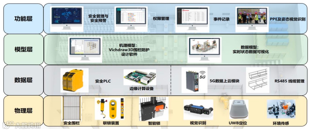 选用模块化的产品是实现可迭代性的有效方式之一。模块化体现在两个方面:一方面,产品的结构本身是模块化的,可以在场地、设备等发生变化时,在原有的基础上做结构模块的增减,增加的结构能与原有的结构在满足标准适用性的前提下进行匹配;另一方面,根据工厂处于不同的发展阶段也能有不同的模块化方案,在物理隔离模块的基础上,可以根据工厂现场需求的变化,选择加装安全防护模块与智能管理模块等。模块化的安全防护系统,见图6。工厂安全数字孪生系统架构,见图7。