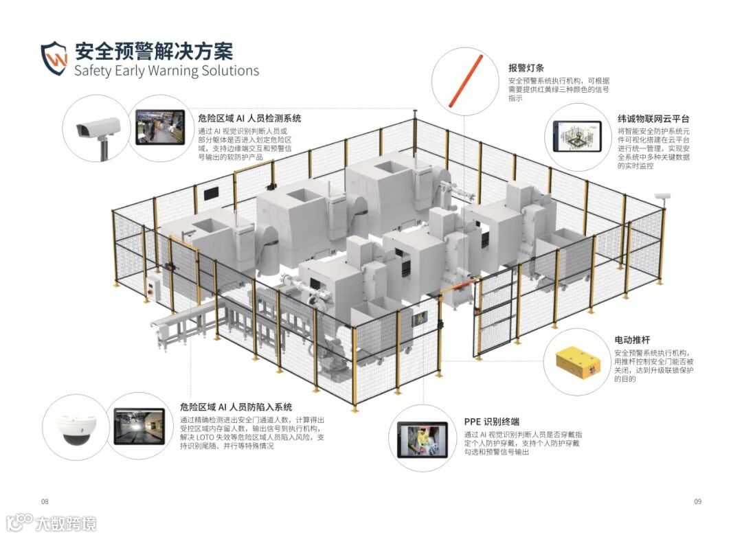 纬诚智能安全防护系统包含七大解决方案,分别是物理隔离、联锁保护、权限管理、安全预警、线缆管理、通道防护、弹性防撞解决方案。可为食品饮料、机械设备、厂房隔离、智能仓储、汽车制造等行业领域定制安全防护系统方案,实现人机隔离,保护人身安全,保障高效生产。