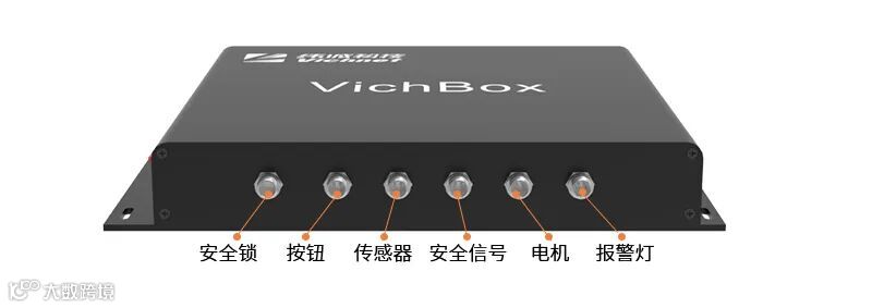 Vichbox多功能控制盒侧边包含红、绿指示灯,三孔品字电源插座,船型开关;底边包含6个航空插头引脚,依次为:安全锁、按钮、传感器、安全信号、电机、报警灯,可根据实际安防需要灵活使用。