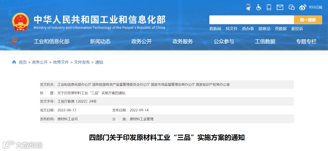 9月14日,工业和信息化部办公厅、国务院国有资产监督管理委员会办公厅、国家市场监督管理总局办公厅、国家知识产权局办公室发布《关于印发原材料工业“三品”实施方案的通知》。