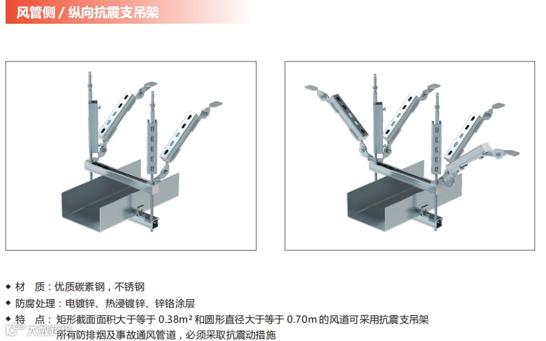 与传统支架相比,抗震支架能综合承载地震时的纵向力和横向力,限制机电系统的位移,缓解地震波作用,达到“小震不损、中震可修、大震不倒”的效果。