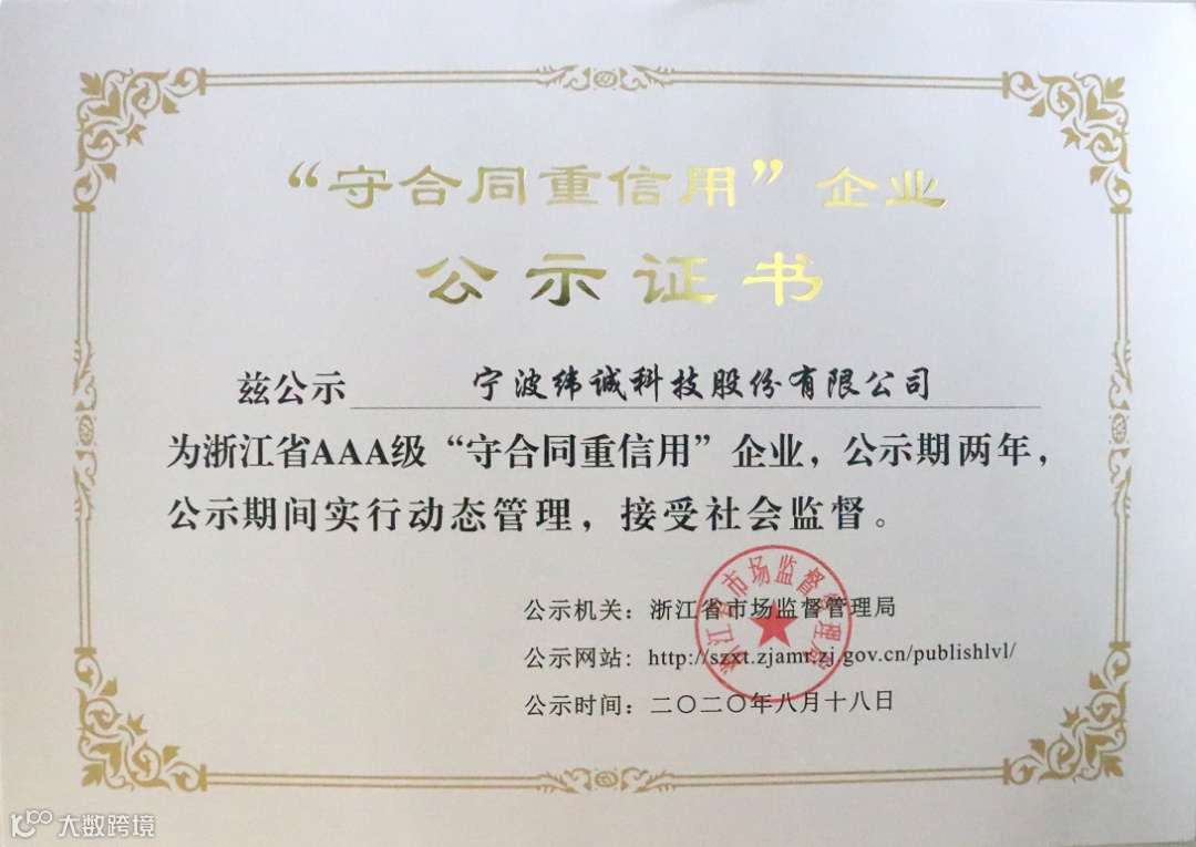 导读:宁波纬诚科技股份有限公司通过严格的审核、评议,入选浙江省AAA级“守合同重信用”企业。