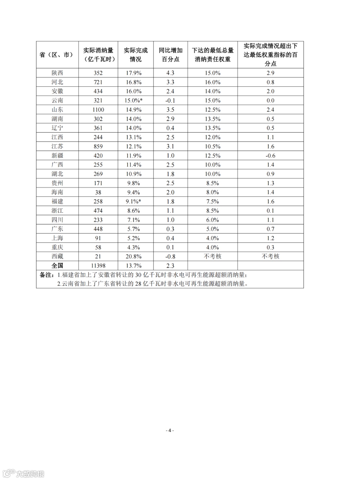 2021年可再生能源电力消纳总量责任权重完成情况如表1,2021年可再生能源电力消纳非水电责任权重完成情况如表2。