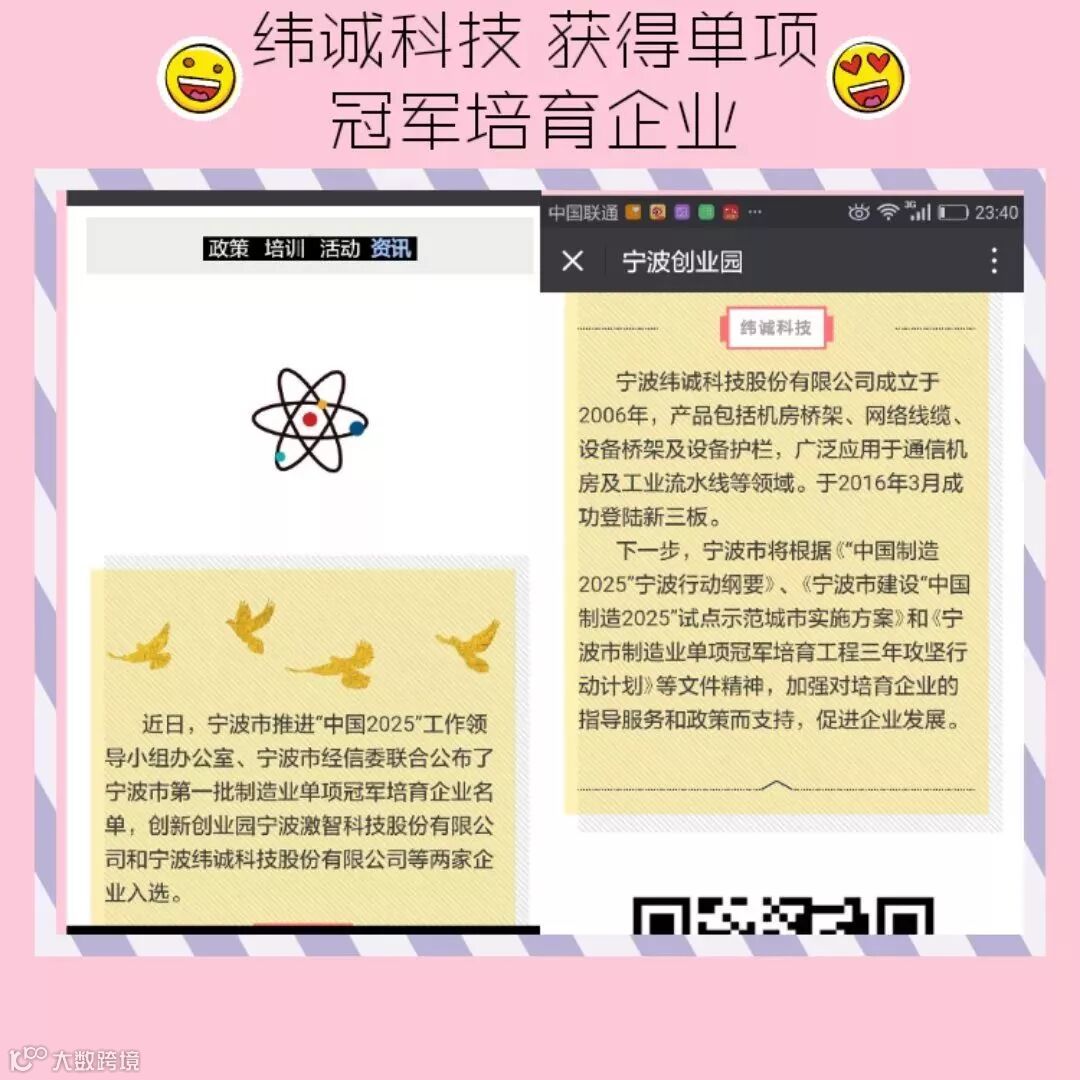 10月26号,纬诚科技股份有限公司被列为宁波市第一批制造业单项冠军培育企业。制造业单项冠军培育,是宁波市推进“中国制造2025”试点示范城市建设8大重点工程之一。