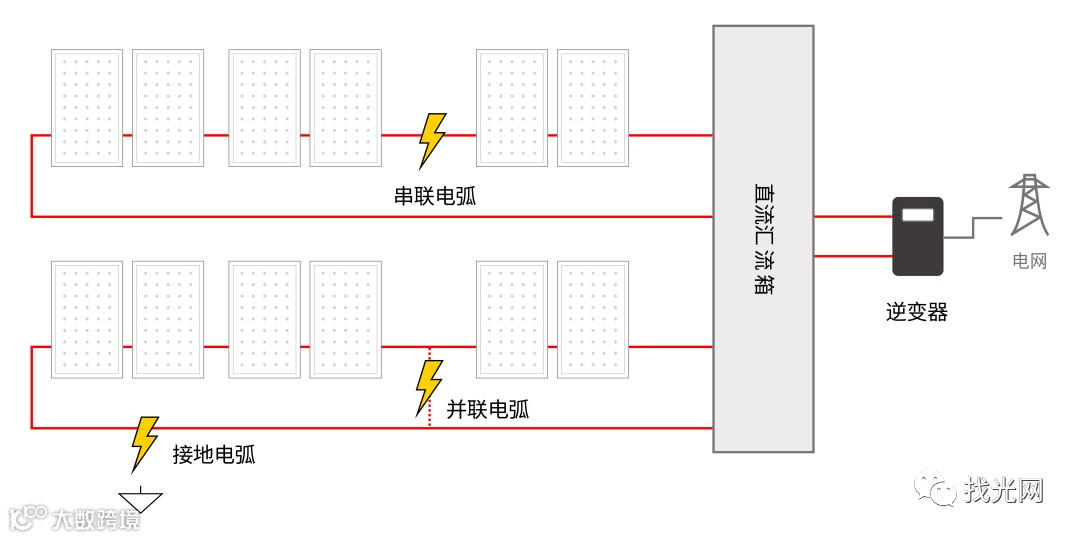 光伏系统中,直流电弧常源于高压拉弧,依据发生的方位可分为3类: