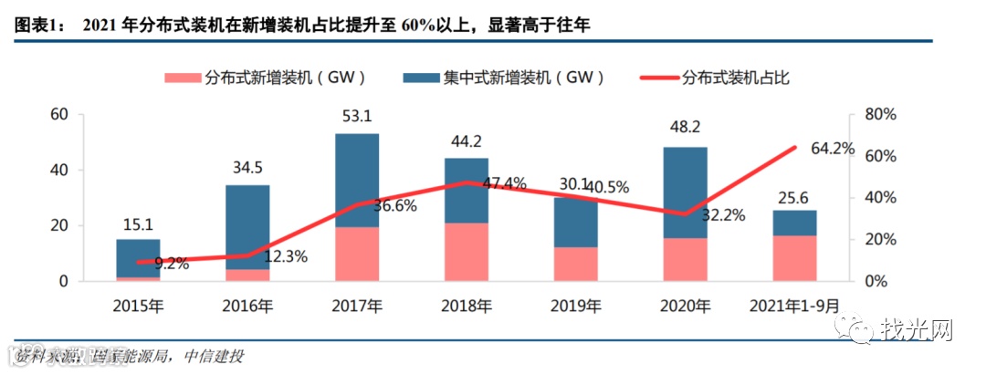 今年前三季度我国分布式装机规模远超集中式,在光伏装机总量中占比64.20%