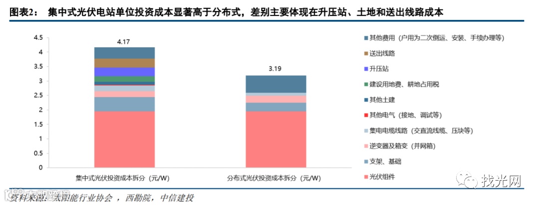 根据太阳能行业协会、西勘院、及中信建投的测算数据,以组件价格1.95元/W测算,集中式光伏电站单位投资成本为4.2元/W;
