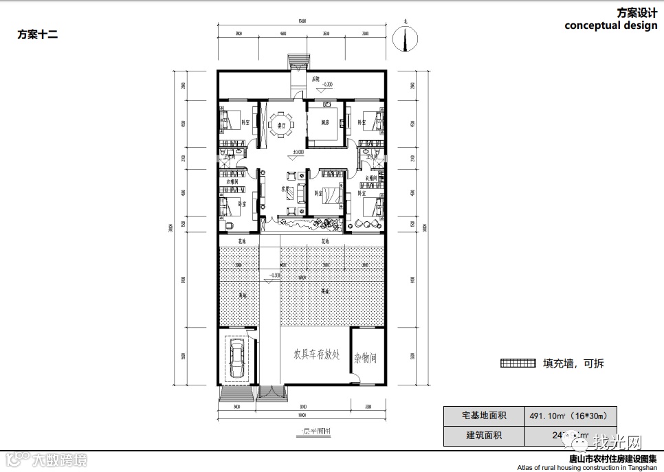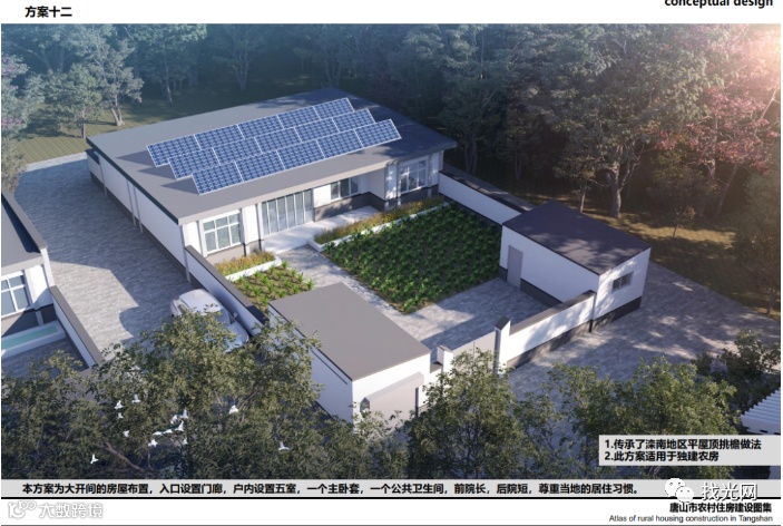 方案十二:传承了滦南地区平屋顶挑檐做法,采用水泥墩+光伏支架形式,为了保证发电量,还要根据不同地区的地理位置,结合实际情况,确定最佳倾角,为了保证前排组件不遮挡后排组件,两排组件之间要留有空间。
