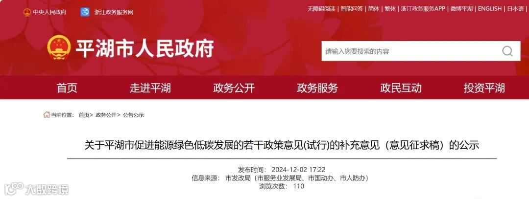 2024年12月2日,平湖市发展和改革局公示了《关于平湖市促进能源绿色低碳发展的若干政策意见(试行)的补充意见(意见征求稿)》,鼓励分布式光伏设备更新,对于并网容量在1兆瓦及以上的,10年以上、转换效率在18%以下或单片功率在250瓦以上的项目实施技改更新,技改完成后经申报通过,将按更新容量给予0.2元/瓦的一次性补助。