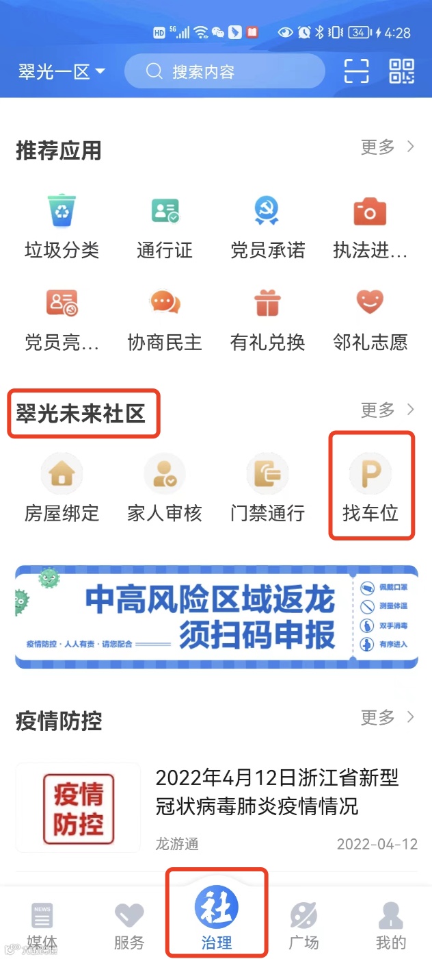 1► 打开“龙游通”APP,点击主页底部“治理”版块,翠光未来社区栏找到“找车位”应用。