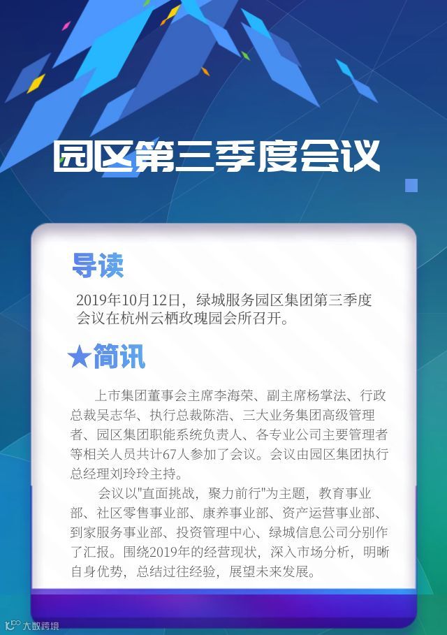导读:2019年10月12日,绿城服务园区集团第三季度会议在杭州云栖玫瑰园会所召开。