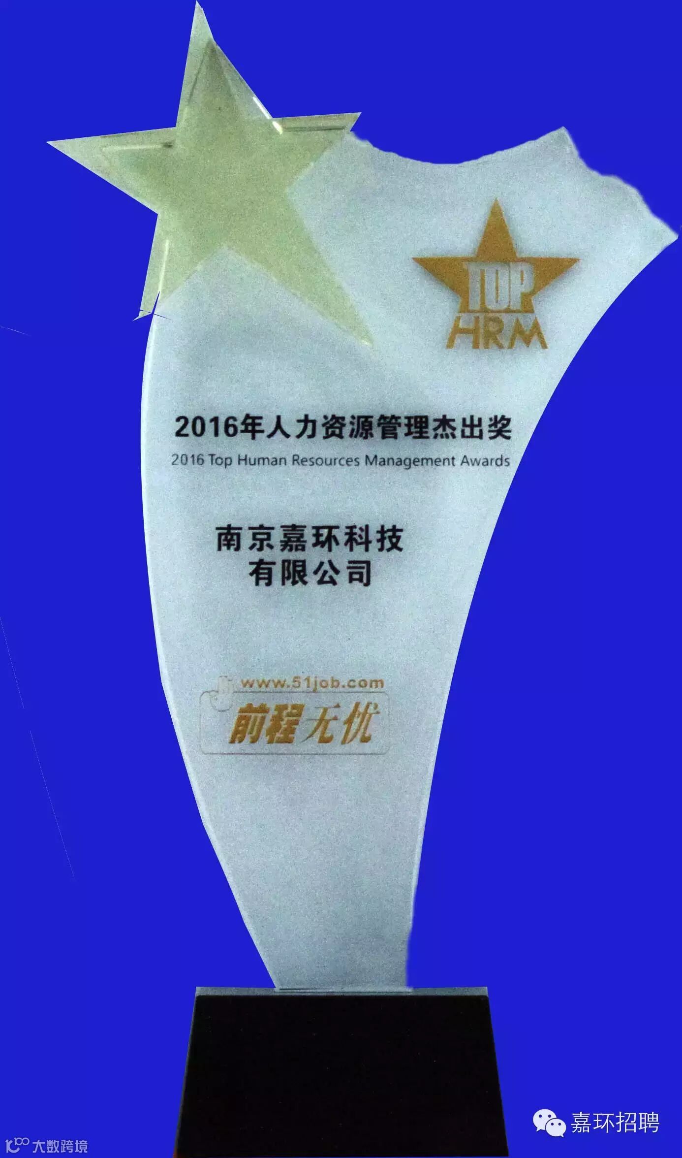 近日,由国内最大的人力资源服务商——前程无忧主办的“2016人力资源管理杰出奖”颁奖典礼,于2016年1月19日在江苏省苏州洲际酒店举行。历经4个多月的严格筛选和评审,嘉环公司在人力资源信息化建设及人才梯队培养方面取得的成绩得到了主办方的认可,最终荣获了 “2016人力资源管理杰出奖”,公司运营总监杨晨先生及人力资源部经理郑浩女士出席颁奖典礼,运营总监杨晨先生代表公司上台领奖。