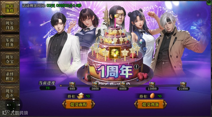 1、活动期间,以服务器为单位,玩家可以在周年庆蛋糕处上交面粉及鸡蛋道具增加蛋糕的制作进度,当制作达到一定进度可领取对应奖励;