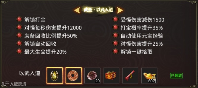 进游戏后小小投资一下,赞助大使直接充值提升到武圣·以武入道,开启自动拾取、自动回收、自动使用元宝经验和各项属性提升。