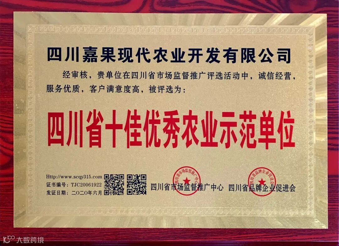近日,经四川省市场监督推广中心和四川省品牌企业促进会多方评选,我司在蒲江的子公司四川省五加一生态农业技术服务有限公司和宜宾江安子公司四川嘉果现代农业开发有限公司荣获五项农业相关认定奖牌: