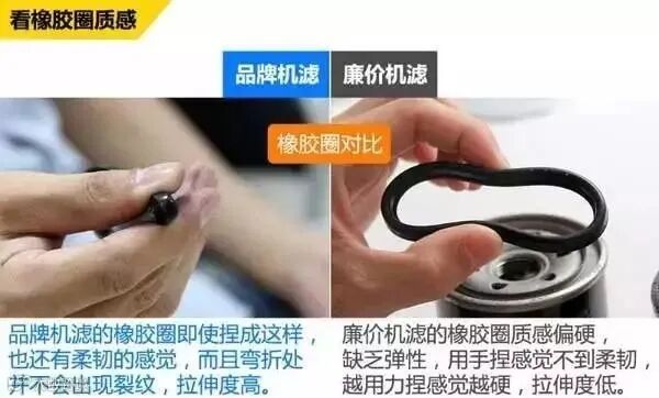 旋装机油滤进出油口的橡胶圈也是判断机滤好坏的参考之一。我们可以将橡胶圈取下,用手捏捏,感受一下橡胶圈的质感。