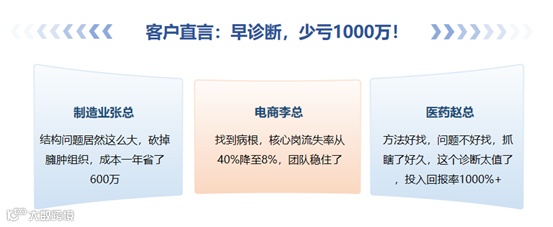 从实际成效来看,华纳客户通过诊断发现的问题,后续进行了组织架构优化、关键人才岗位调整、薪酬绩效方案优化等关键举措撬动组织实现1000万级的成本优化、业绩提升。