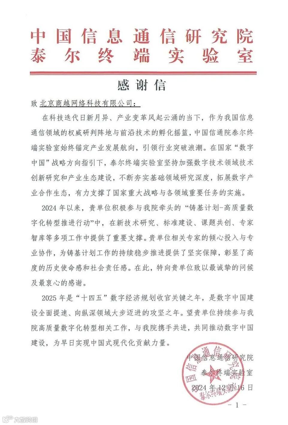 近日,商越科技收到了中国信息通信研究院泰尔终端实验室(以下简称“中国信通院”)发来的感谢信,信中充分肯定了商越在过去一年对中国信通院“铸基计划”的