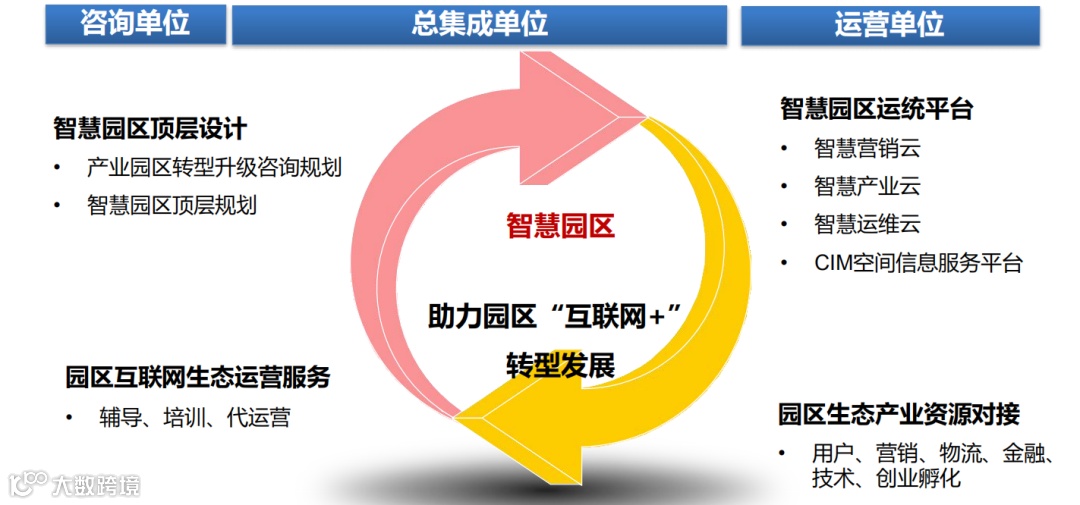 园区承担着“承上启下”的重要作用。从规模上看,园区是仅次于城市的空间单位,囊括了智慧工厂、智慧社区、智慧商区以及更小的智慧空间。