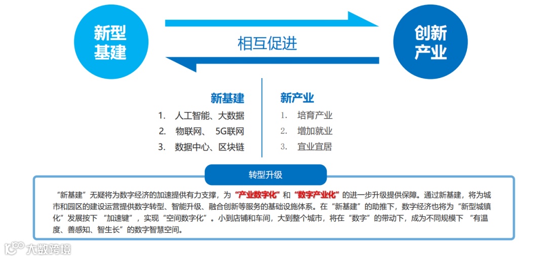 “新基建”无疑将为数字经济的加速提供有力支撑,为“产业数字化”和“数字产业化”的进一步升级提供保障。通过新基建,将为城市和园区的建设运营提供数字转型、智能升级、融合创新等