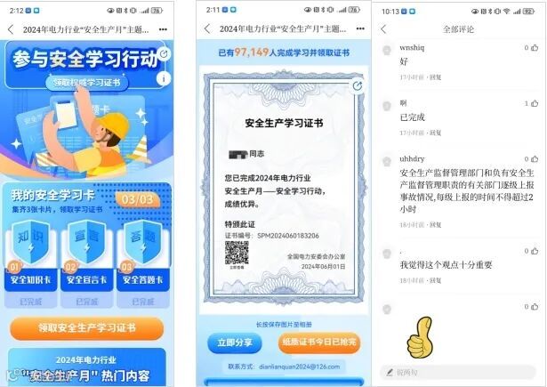 据后台数据统计,“安全生产月”主题活动上线一周,访问量已超过300万次。期间,电力员工不仅踊跃参与答题环节,而且每日在线深入学习数百条安全生产相关法律法规及专业知识,并在评论区积极留言互动,甚至互相“划重点”,显著提升了全体电力员工对安全生产的履职能力和意识。
