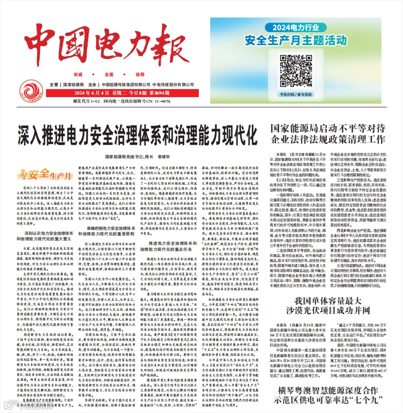 6月4日,国家能源局党组书记、局长章建华发表题为《深入推进电力安全治理体系和治理能力现代化》的署名文章,明确电力安全治理体系和治理能力现代化的重大意义、重要原则和重点任务,营造了推动电力安全高质量发展、共筑安全防线的浓厚氛围。