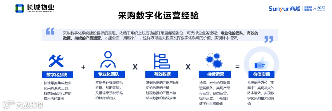 在11月17日“加速采购智能化”商越科技年度用户大会上,长城物业供应链管理中心总监王波在《长城物业采购数字化实践分享》中回顾了长城物业供应链采购管理系统一应荟的上线历程,并介绍了一应荟如何一改长城物业以往零散、无序的采购管理状态,实现员工赋能、优化供应池资源、降低采购业务风险和模式创新价值。