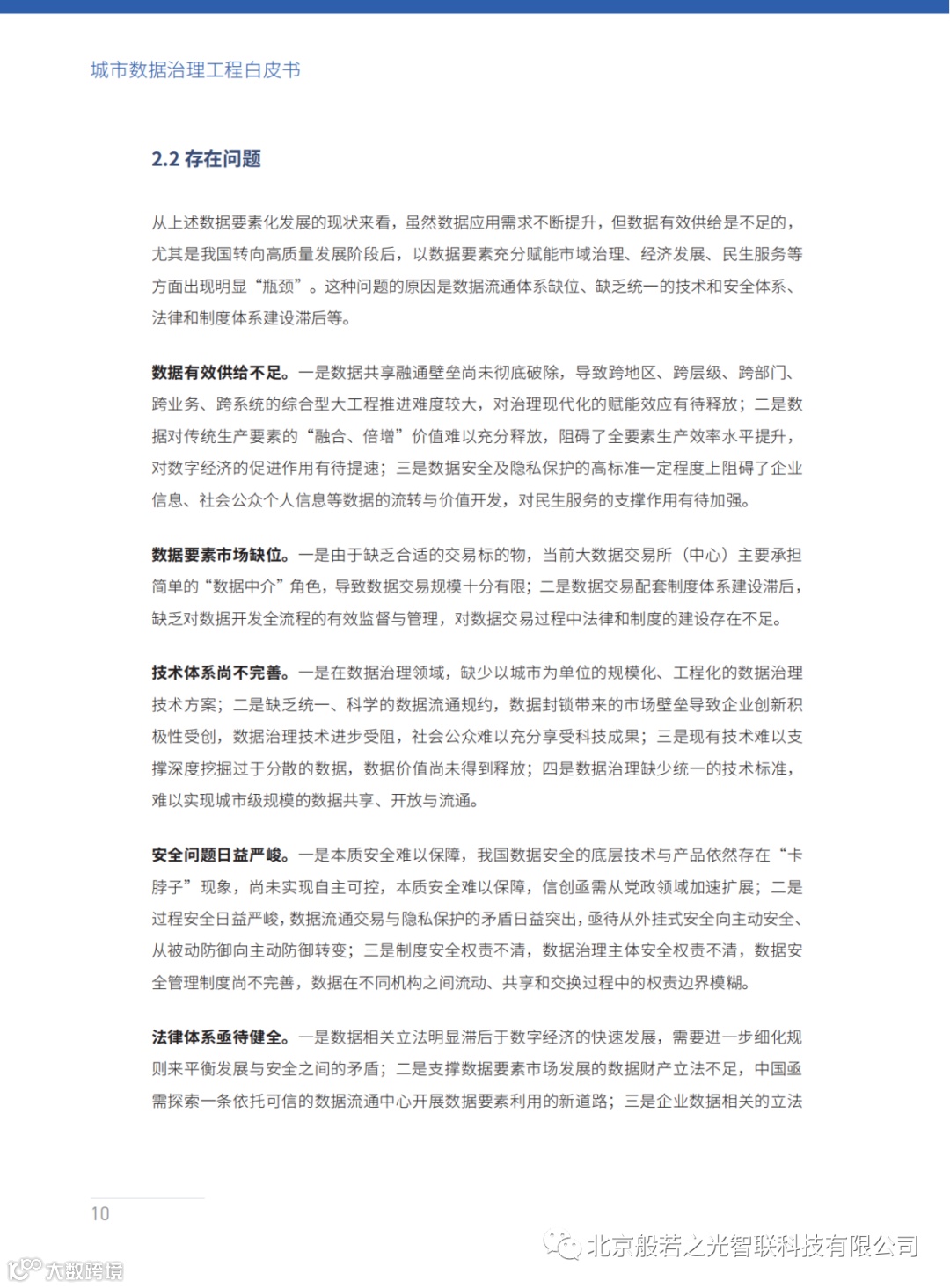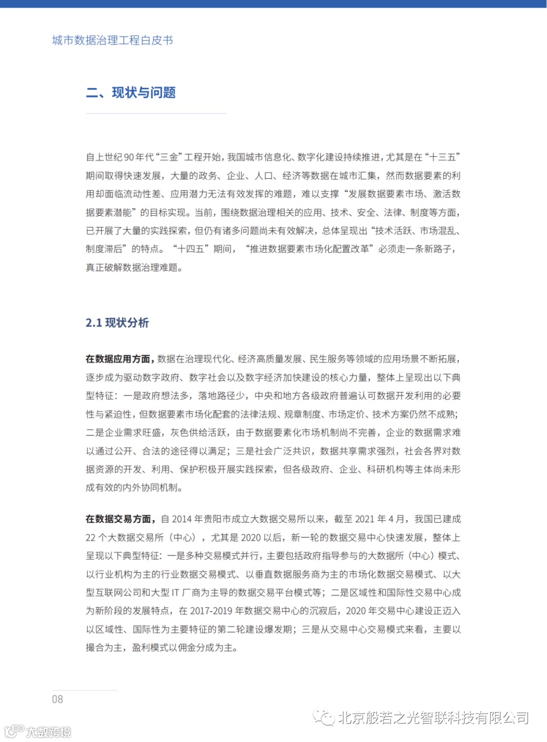 2、第二部分介绍现状与问题。说明当前数据治理工作现状,分析数据要素利用所面临的难题及其原因,重点阐明数据流通与数据安全的矛盾,数据资源开发利用的紧迫性与数据资产化体系建设的滞后性的矛盾,以及数据供需两旺与数据要素市场缺位的矛盾,并对生产要素一般规律和数据要素市场化的基本特征进行分析。