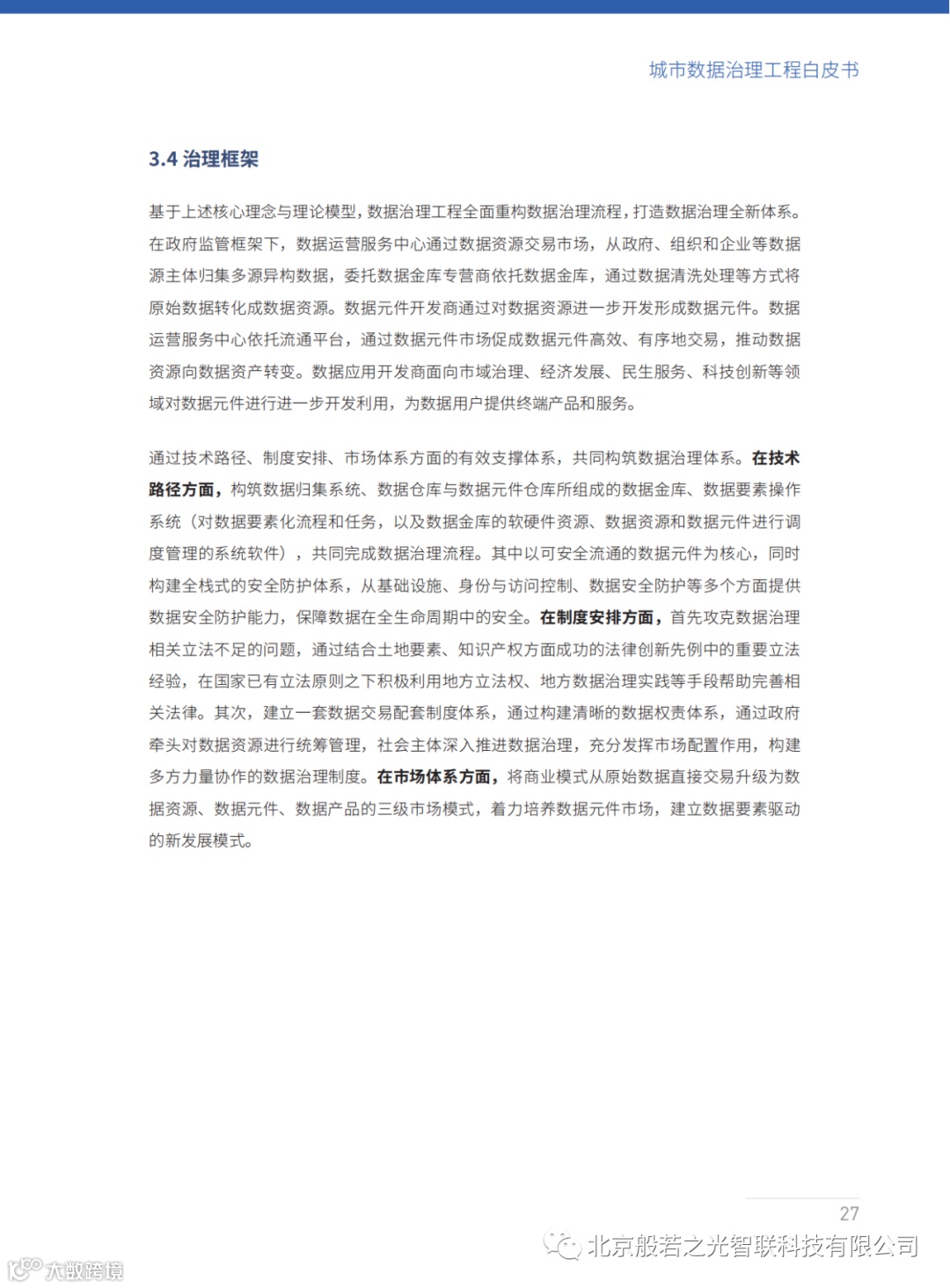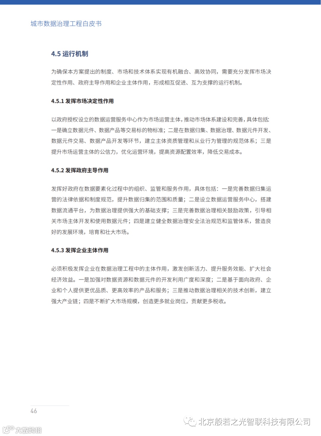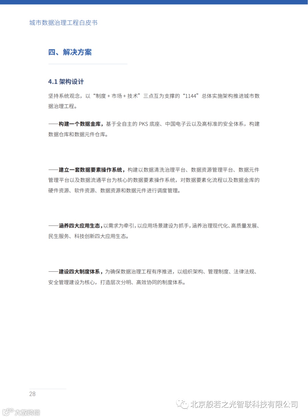 4、第四部分介绍解决方案并对架构设计方案进行整体阐述。构建了以数据归集系统、数据金库、数据要素操作系统、全栈式数据安全防护体系、数据治理标准体系和应用生态体系等为内容的技术体系方案;以组织机构、管理制度、法律法规和安全管理为内容的制度体系方案;以三级市场、定价机制和市场监管为内容的市场体系方案;以“发挥市场决定性作用、政府主导作用和企业主体作用”为内容的运行机制。