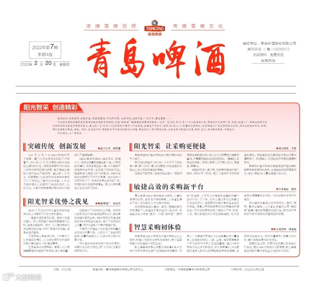 青啤内刊《青岛啤酒》创刊于1994年,以“浓缩青啤历程,传播青啤文化”的办报宗旨深受青啤员工喜欢。近日,2022年第7期3版—青啤动态—“阳光智采 创造精彩”记载了工厂一线用户对采购平台的使用心声。来看看,他们怎么说~