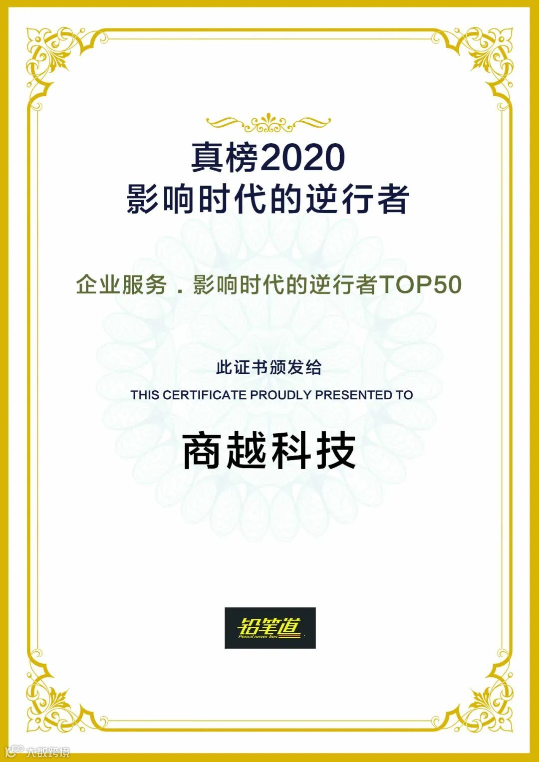 1月20日,铅笔道真榜•2020正式发布,商越科技凭借独特的商业模式及可观的资本价值入选“2020真榜·企业服务·影响时代的逆行者TOP50”。
