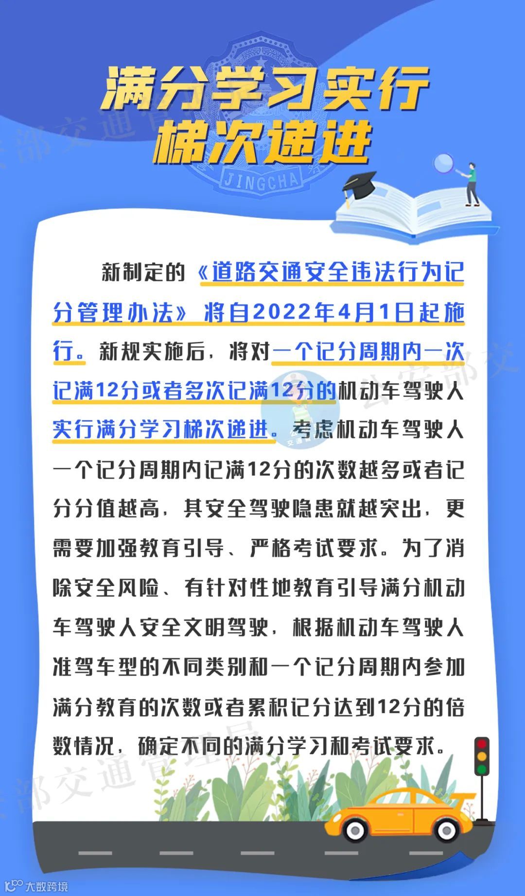 考虑机动车驾驶人一个记分周期内记满12分的次数越多或者记分分值越高,其安全驾驶隐患就越突出,更需要加强教育引导、严格考试要求。为了消除安全风险、有针对性地教育引导满分机动车驾驶人安全文明驾驶,根据机动车驾驶人准驾车型的不同类别和一个记分周期内参加满分教育的次数或者累积记分达到12分的倍数情况,确定不同的满分学习和考试要求。