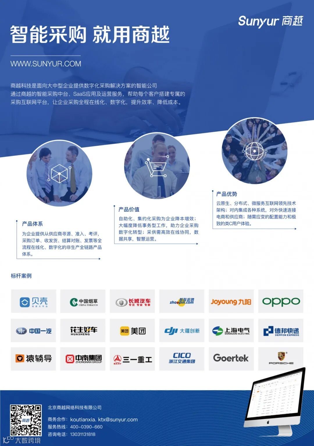 商越科技是企业采购数字化转型的服务商,在互联网、汽车制造、电子制造、能源化工、物流快递、地产建筑、烟草等诸多领域拥有深厚的行业知识及实践经验,已与链家集团、智联招聘、长城汽车、中国一汽、花生好车、宁波华翔、美团点评、上海电气、OPPO、九阳股份、广西中烟、大疆创新、猿辅导、德邦快递、中南集团、三一重工、歌尔声学、保时捷、迈瑞医疗、友邦人寿等行业领军企业达成合作。