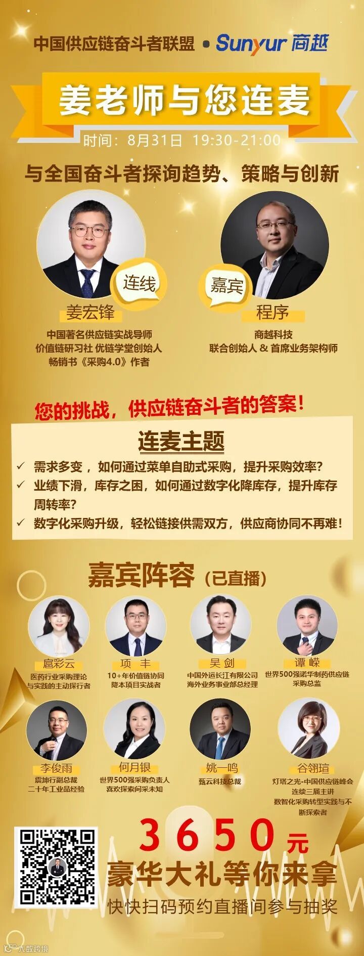 导读:采购专家姜宏锋老师与商越程序老师直播连麦,解密间采需求多变、多品种小批量,采购周期长等破局之道