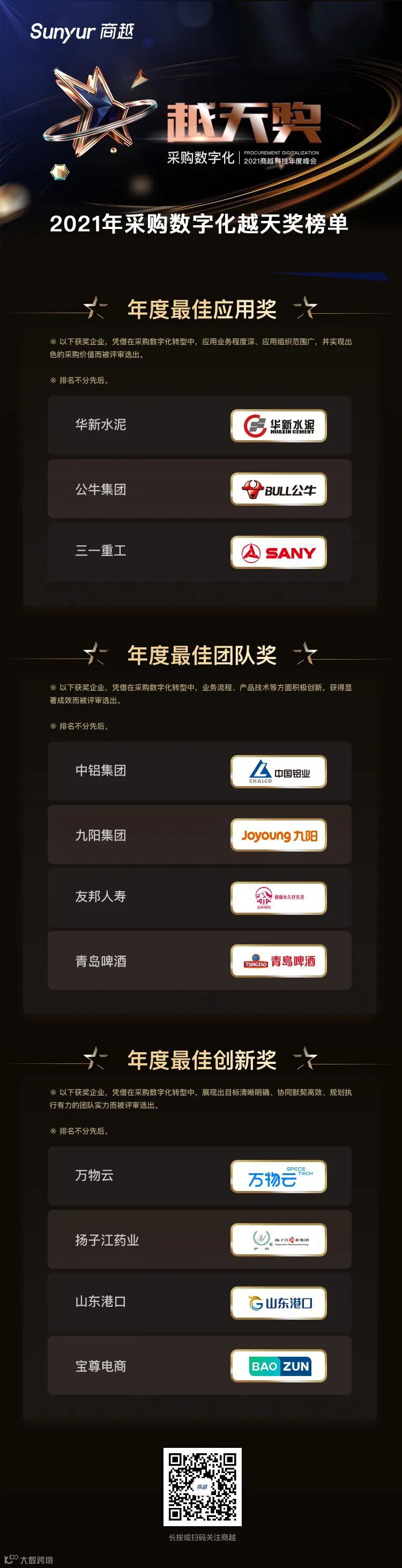11月18日,首届“采购数字化转型【越天奖】”榜单重磅出炉,并在“新技术重构采购价值·2021商越科技年度峰会”举行了颁奖盛典。