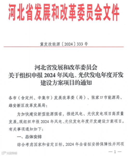 导读:3月11日,河北省发改委发布《关于组织申报2024年风电、光伏发电年度开发建设方案项目的通知》。