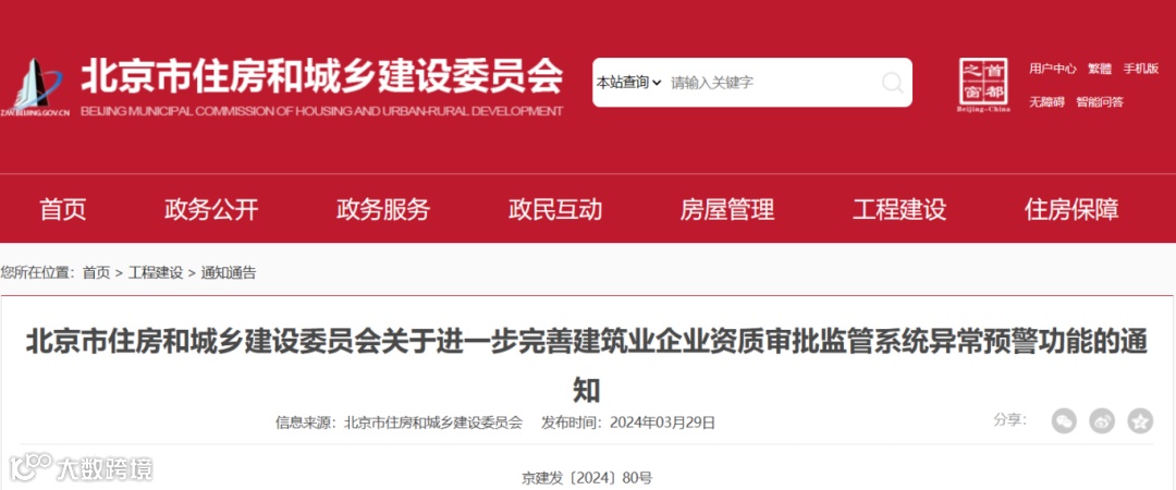 3月29日,北京市住建委发布《关于进一步完善建筑业企业资质审批监管系统异常预警功能的通知》(京建发〔2024〕80号)。本通知自印发之日起施行,《关于加强建筑业企业资质审批监管系统异常预警企业监管的通知》(京建发〔2021〕80号)同时废止。其中明确: