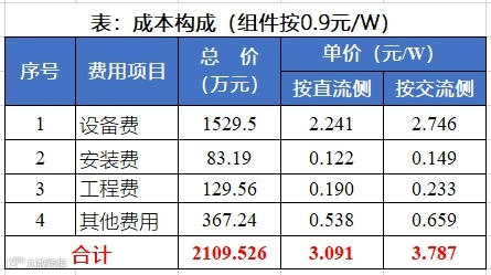 考虑到组件价格下降,如果光伏组件价格按0.9元/W计取,其他各项费用不变,项目总投资则降为2109万元,按直流端规模计算,折合3.1元/W。具体如下表所示.