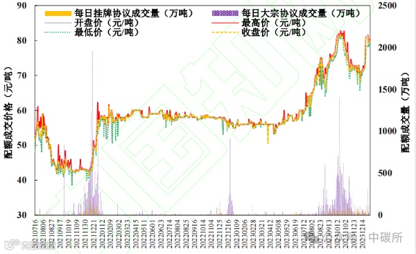 中国全国碳市场每日配额成交量与成交均价