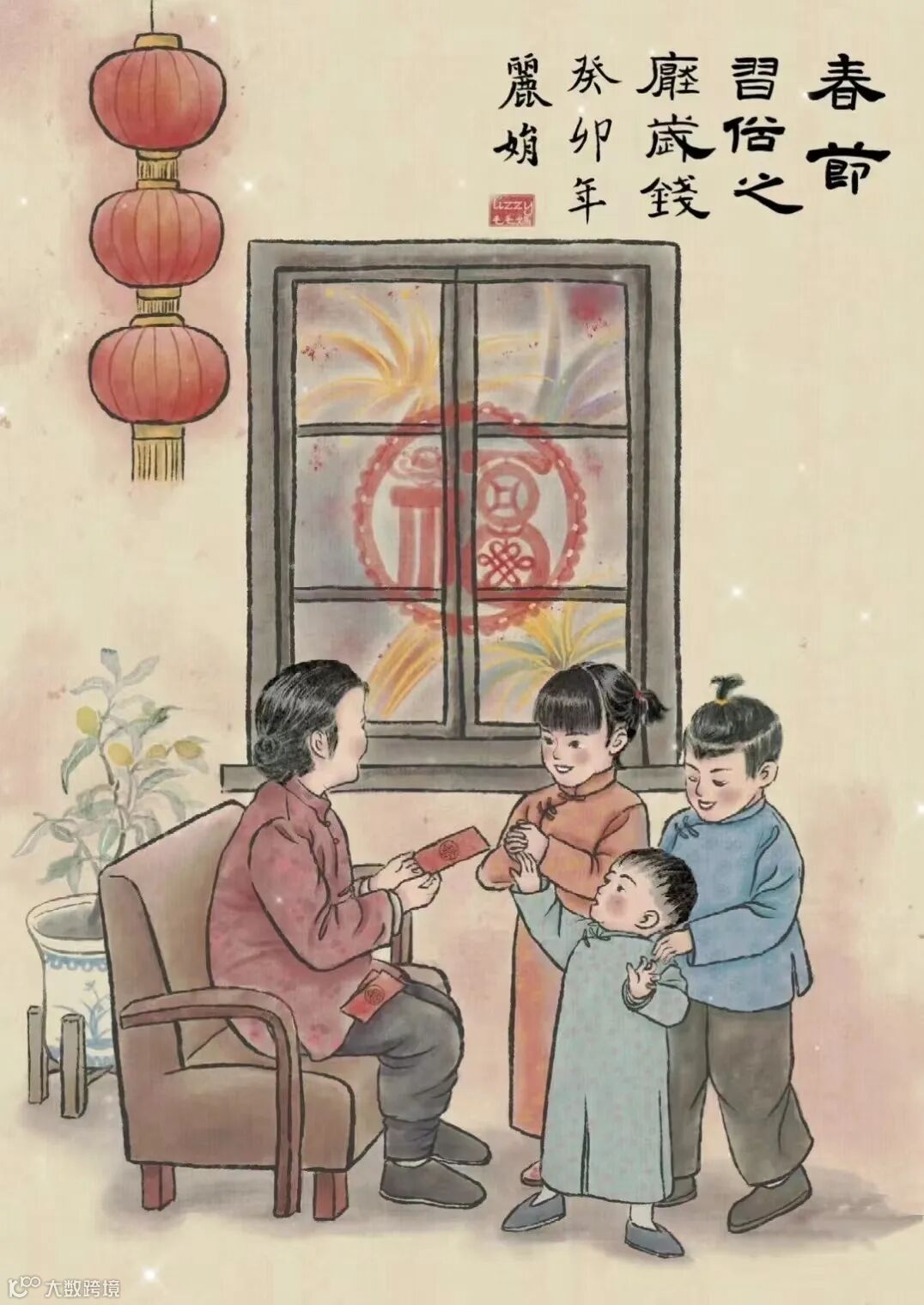 压岁钱,是过年习俗之一,年晚饭后长辈要将事先准备好的压岁钱分给晚辈,据说压岁钱可以压住邪祟,晚辈得到压岁钱就可以平平安安度过一岁。压岁钱在民俗文化中寓意辟邪驱鬼,保佑平安。
