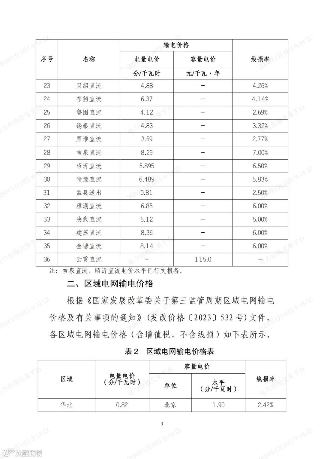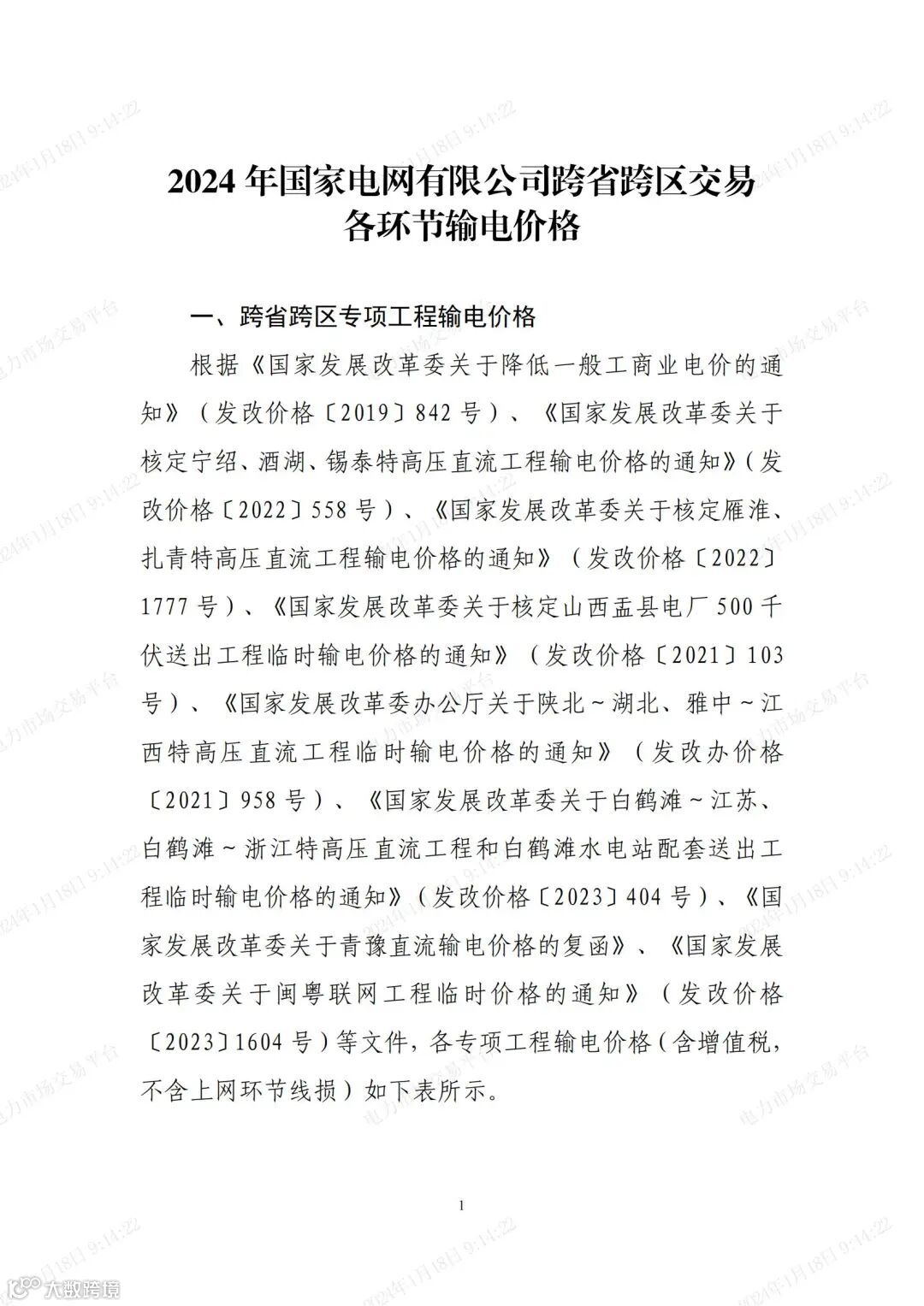 北京电力交易中心发布了2024年国家电网有限公司跨省跨区交易各环节输电价格。