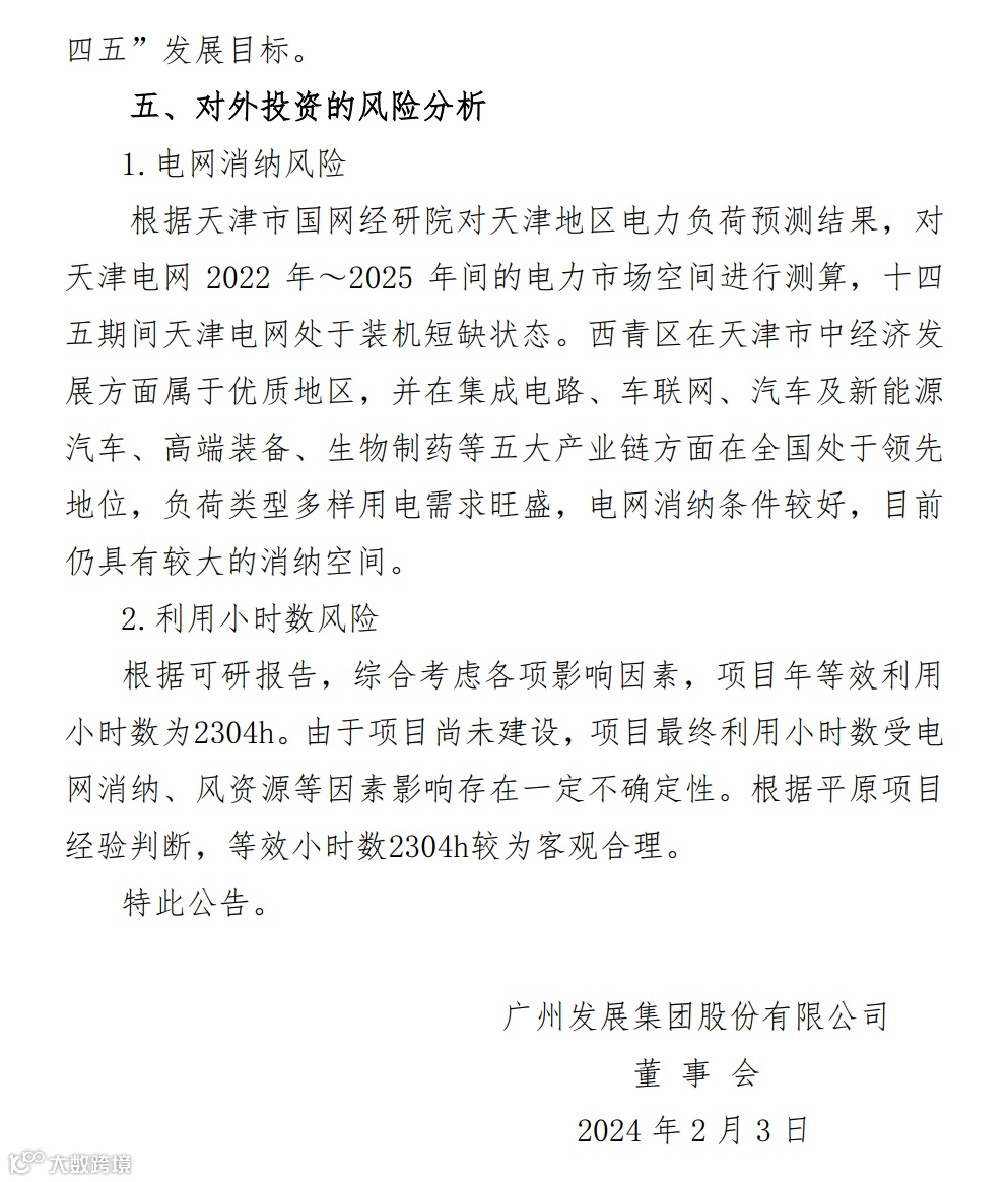 2024年2月3日,广州发展发布《广州发展集团股份有限公司关于投资建设天津市西青区750MW风力发电项目的公告》。根据公告显示,广州发展全资子公司广州发展新能源股份有限公司拟投资建设天津市西青区750MW风力发电项目。