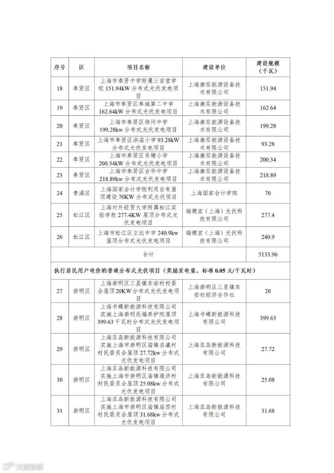 文件指出,根据《上海市可再生能源和新能源发展专项资金扶持办法》(沪发改规范〔2022〕14号,以下称“14号文”)、《关于开展上海市可再生能源和新能源发展专项资金扶持项目线上申报试点工作的通知》(沪发改能源〔2023〕174号),市发展改革委会同市财政局组织开展了2023年第二批可再生能源和新能源发展专项资金奖励目录的核实确认工作。
