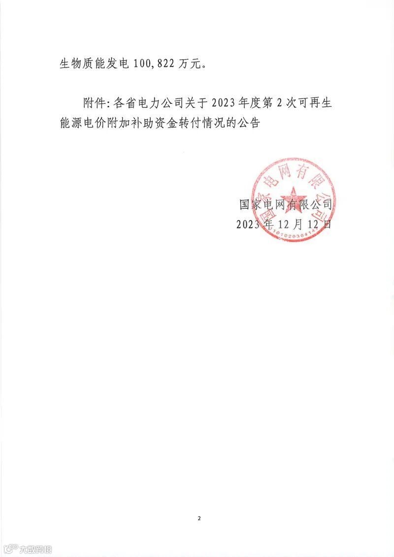 按照《财政部 国家发展改革委 国家能源局关于印发<可再生能源电价附加资金管理办法>的通知》(财建〔2020〕5号)文件要求,国家电网有限公司(以下简称“公司”)将2023年第2次可再生能源电价附加补助资金的拨付原则和顺序等相关情况公告如下: