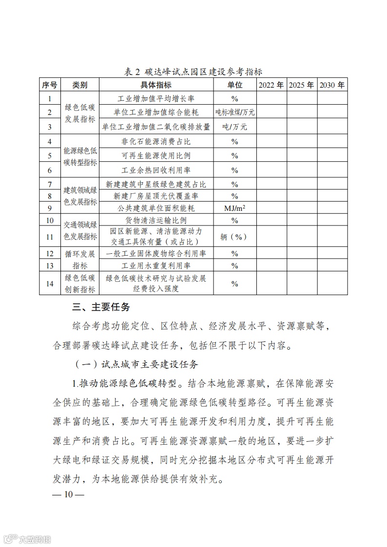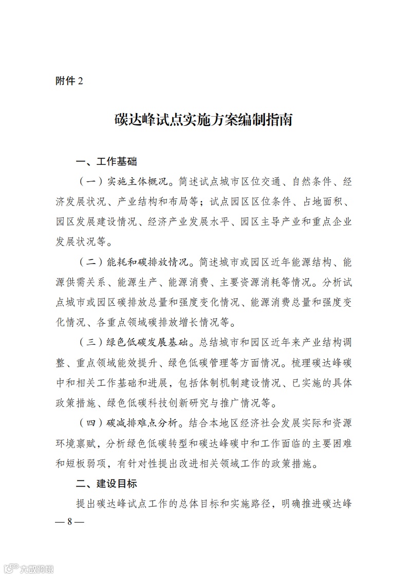 答:中共中央、国务院印发的《关于完整准确全面贯彻新发展理念做好碳达峰碳中和工作的意见》提出,要组织开展碳达峰碳中和先行示范,探索有效模式和有益经验。国务院印发的《2030年前碳达峰行动方案》明确,要加大中央对地方推进碳达峰的支持力度,选择100个具有典型代表性的城市和园区开展碳达峰试点建设,在政策、资金、技术等方面对试点城市和园区给予支持,加快实现绿色低碳转型,为全国提供可操作、可复制、可推广的经验做法。