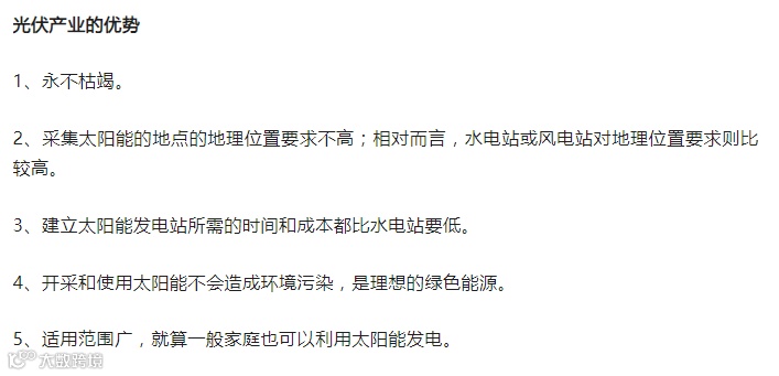 光伏产业指以太阳能光伏技术为主要技术,利用太阳能发电、利用太阳能热发电或太阳能光提炼制取物质及各种必要的及其他涉及的生产技术的总称。它是一个比较新兴的产业,它利用太阳能直接变换可供人们使用的有价能源,因此有着巨大的发展前景,且在发展的过程中,也可以有力的拉动社会的全面发展。