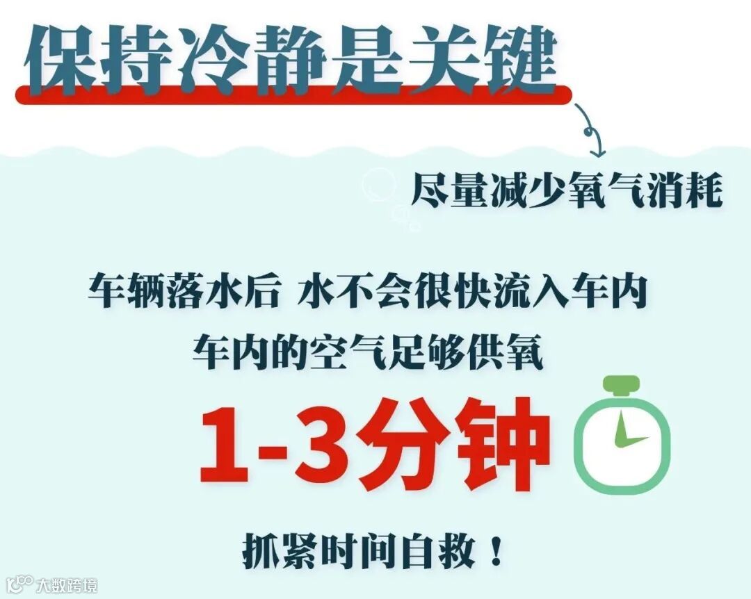 一定要牢记落水先开车门,车门推不开,就用安全锤砸侧车窗。平时我们一定要把安全锤放在随手就能拿到的地方。