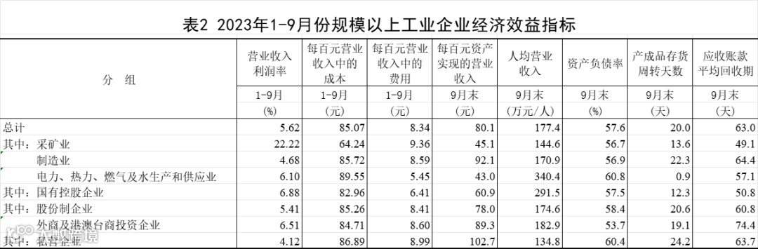 9月末,规模以上工业企业每百元资产实现的营业收入为80.1元,同比减少5.8元;人均营业收入为177.4万元,同比增加6.0万元;产成品存货周转天数为20.0天,同比增加1.2天;应收账款平均回收期为63.0天,同比增加5.9天。