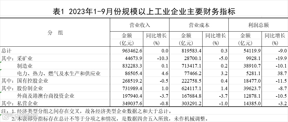 1—9月份,全国规模以上工业企业实现利润总额54119.9亿元,同比下降9.0%,降幅比1—8月份收窄2.7个百分点(按可比口径计算,详见附注二)。